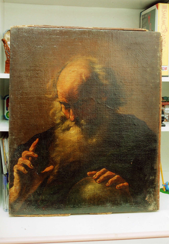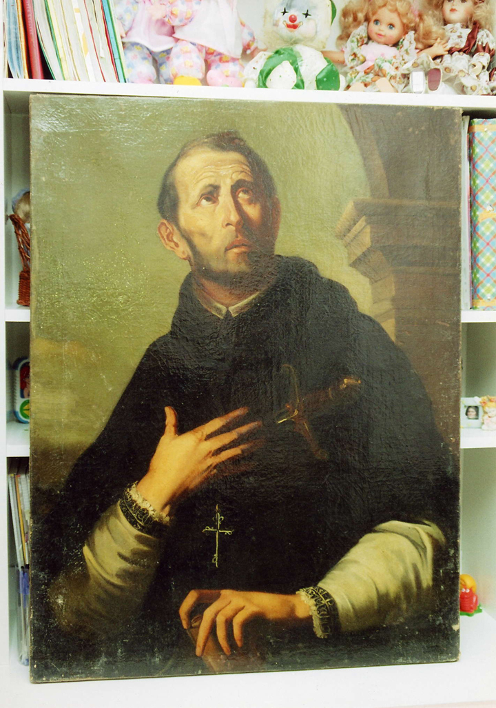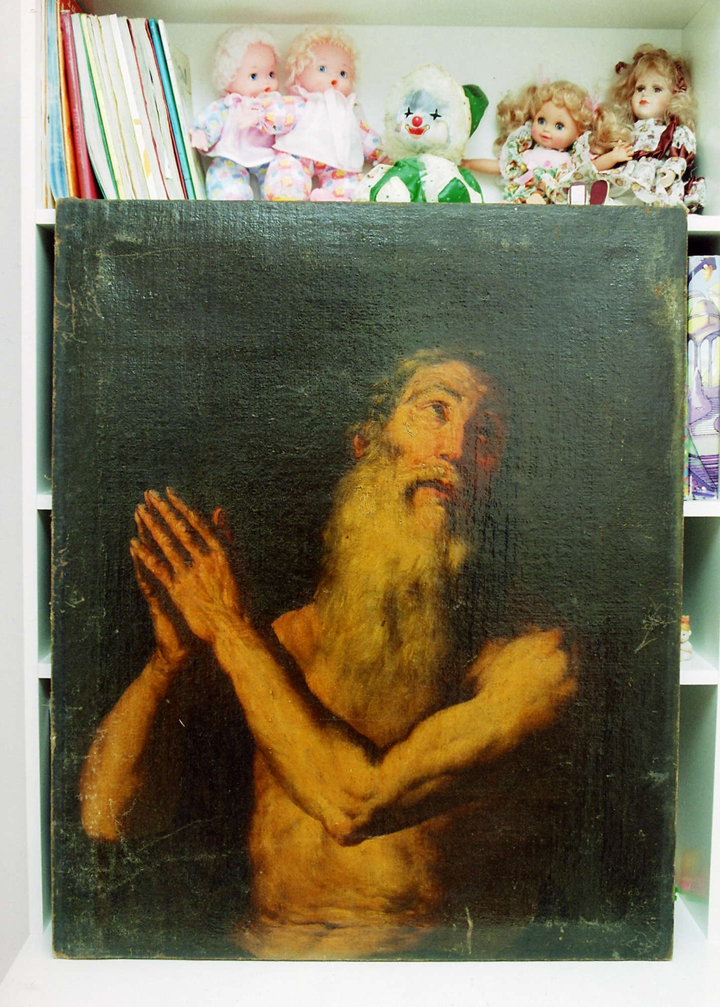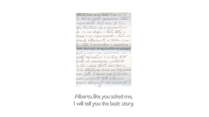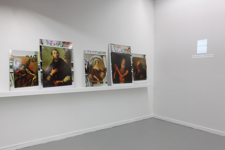Photos of stolen paintings and a video projection of a handwritten letter from a contact person of the thieves about the theft, which took place over 30 years ago at a Roman church. The paintings have been kept hidden in a farmer’s shed ever since. De Michele obtained the photos of the paintings by passing himself off as a prospective buyer.