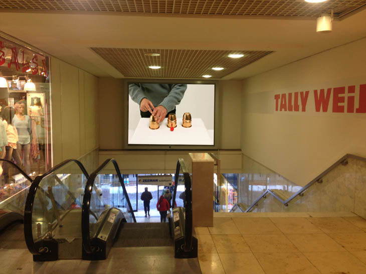 This nimble-fingered game looks like a magic act, but it is a con-trick. Thimblerig was played frequently in Utrecht city centre in the 1980s. It was outlawed in 1991, but with this video Alberto De Michele brings it back to the public space. The Dutch-Italian artist often takes inspiration from the world of criminality. His artwork replaces the advertisements that are generally displayed in this illuminated sign and shows us another form of deception.