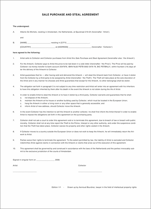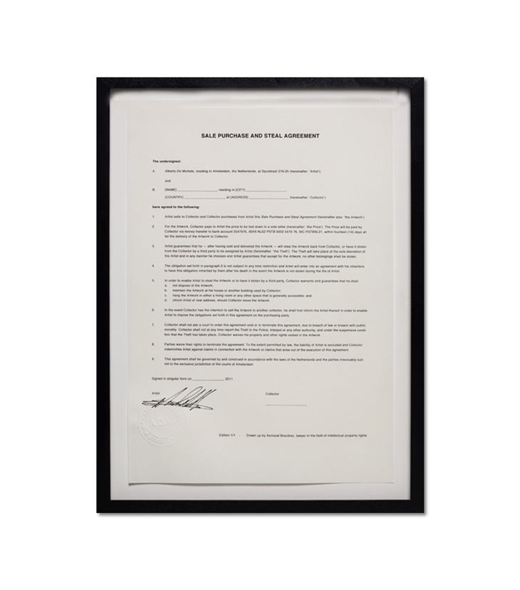A contract that says that the work in question (the framed contract) will at some point be stolen by me or a third party assigned by me. Framed inkjet print. 38x27 cm.